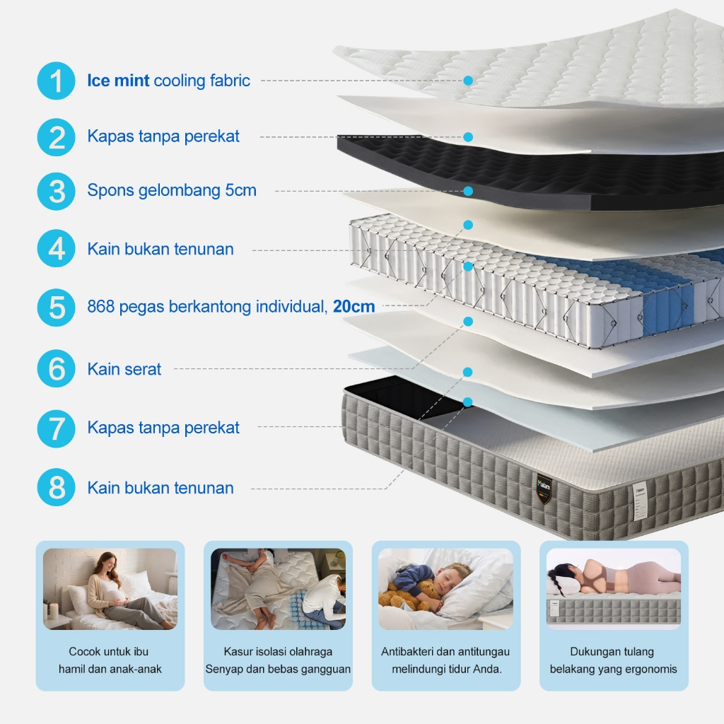 Malam Kasur Springbed - IceMint Cooling Mattress - FREE Bantal - Ukuran kasur 90x200, 120x200, 160x200, 180x200