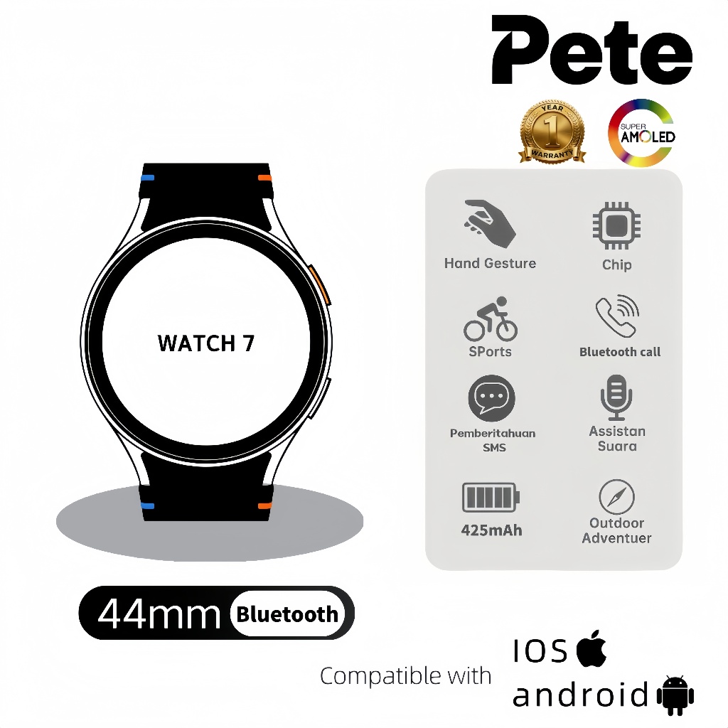 [NEW ORI] PETE WATCH 7 44MM Bluetooth AMOLED Layar sentuh definisi tinggi IP68 Waterproof GPS NFC Smart watch Pria Wanit
