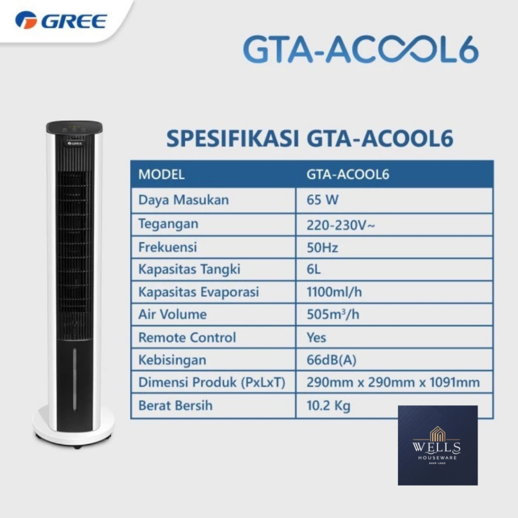 Wells Houseware - Gree - Tower Air Cooler - Anion Generator - Aromaterapi - Kapasitas 6L - Gta-Acool6