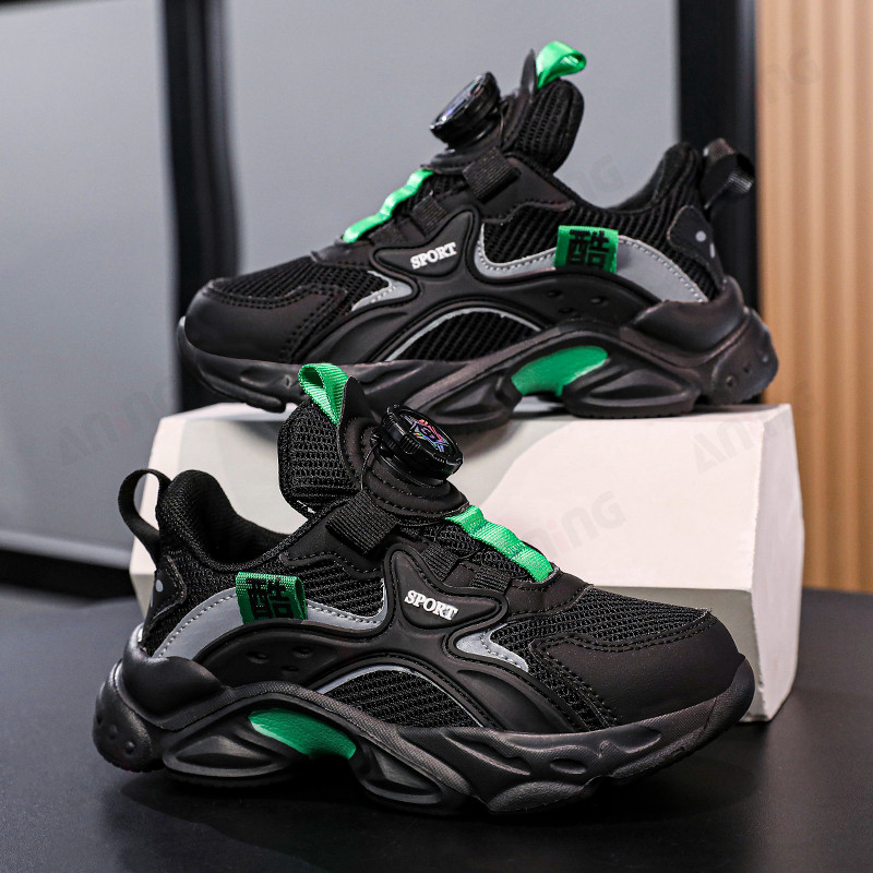 Aning Aningboy-Sepatu Hitam Sekolah Sepatu Anak Laki-Laki Casual Sneakers Ringan Tombol Putar Mesh Running Shoes