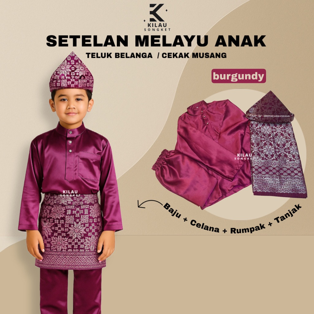 Setelan Melayu Anak Baju Celana Cekak Musang Teluk Belanga dengan Rumpak Tanjak Songket