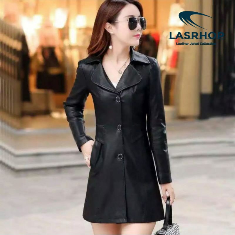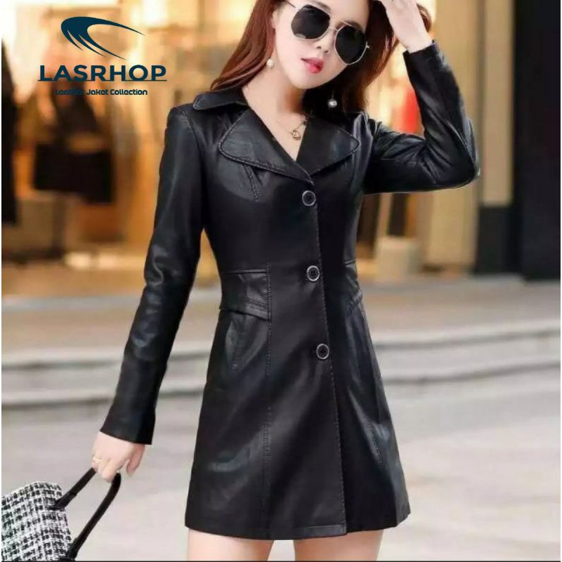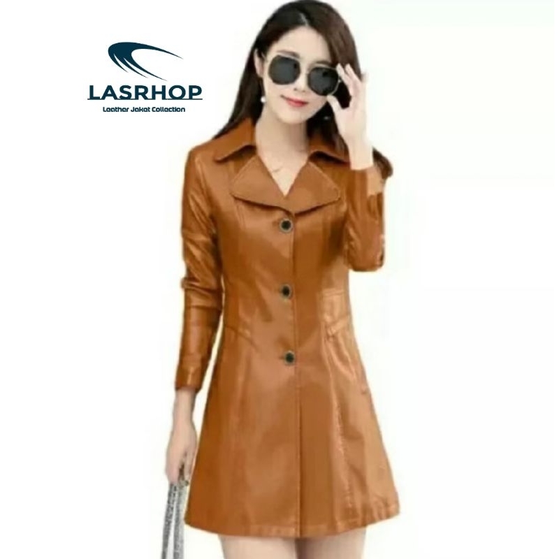 Jaket Long Coat Wanita Kulit Sintetis/Jaket Jubah Wanita Semi Kulit/Jaket Fashion Wanita Terlaris