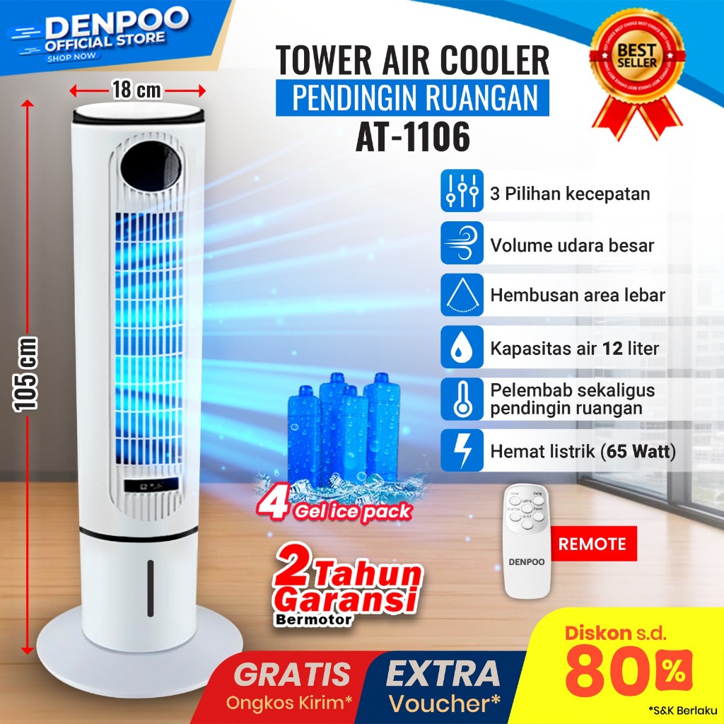 Tower Fan Air Cooler Denpoo - Kapasitas 4 Liter Model - At 1106 - 65 Watt
