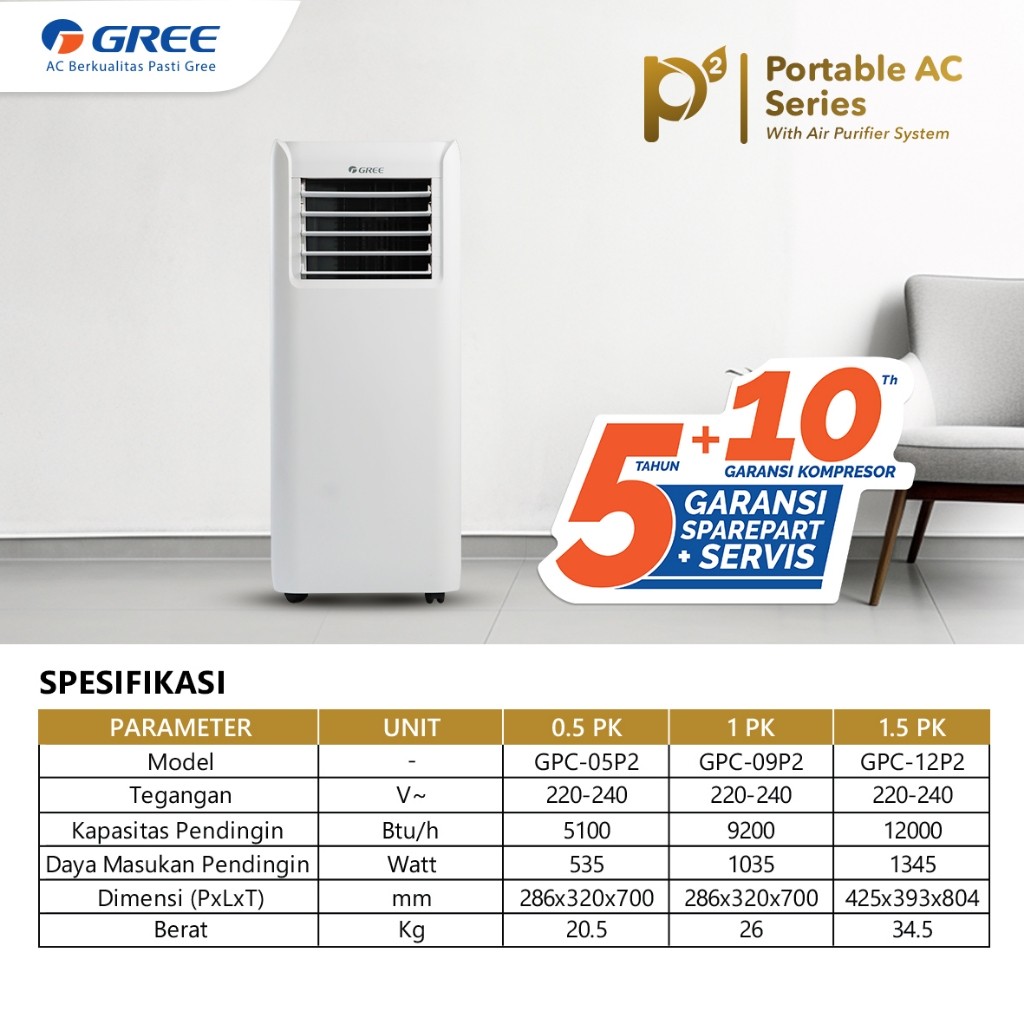 Gree Ac Portable 0,5 Pk - 1.5Pk - Air Purifier - Multiplen Speeds - Warna Putih - Model Gpc-05P2