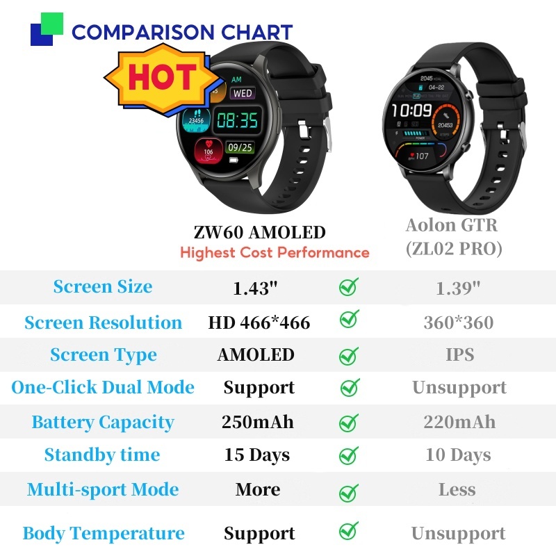 AMOLED ZW60 SMARTWATCH 1.43 Round Screen Incoming Call Alert Heart Rate Health Monitor Remote Control Message Reminder M