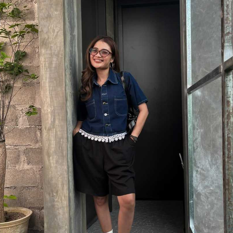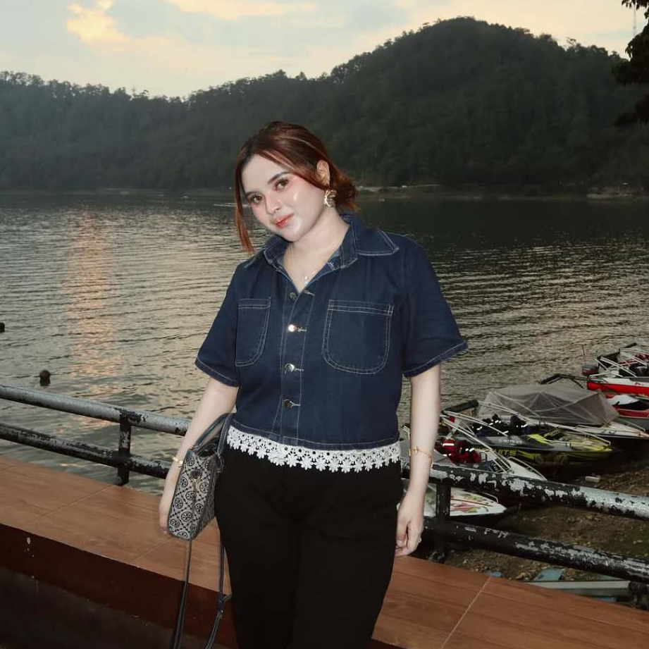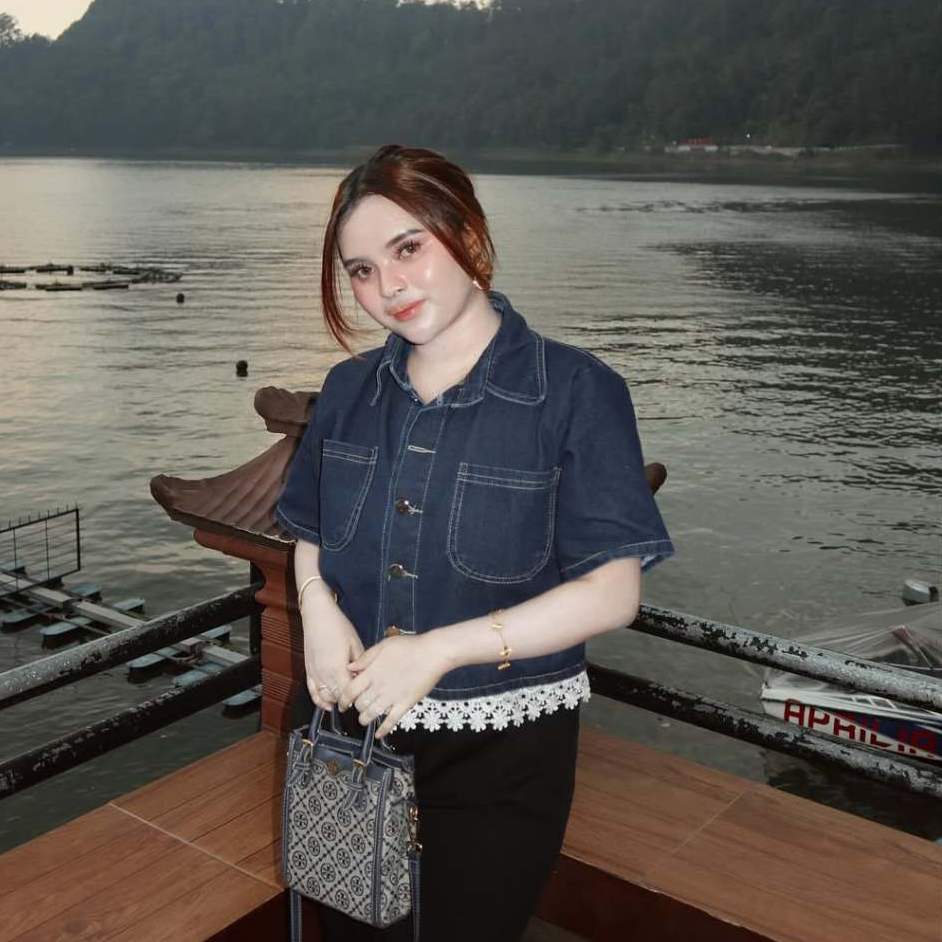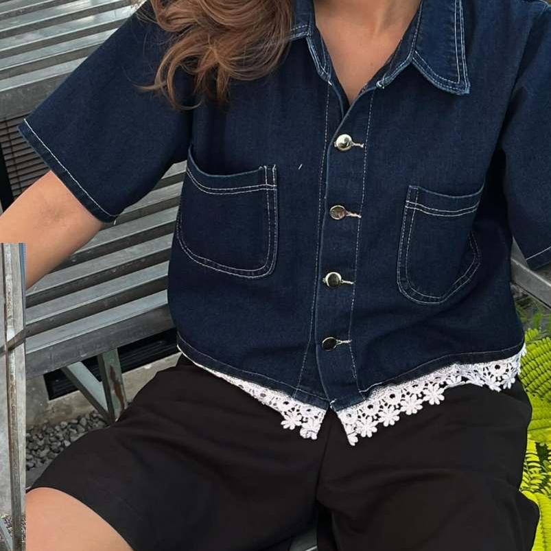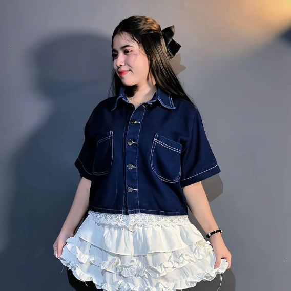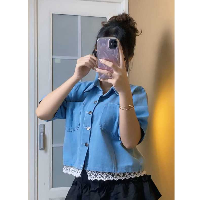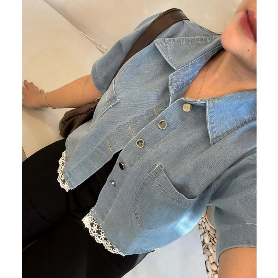 Selina Kemeja Crop Denim Wanita Lengan Pendek Crop Shirt Denim Wanita Korean Crop Shirt Denim Wanita Korean Crop Casual