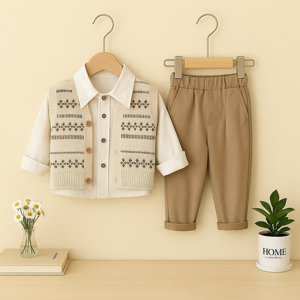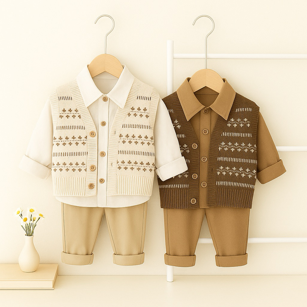Setelan Anak Laki Laki Rompi Rajut Korean Style Kemeja Putih & Coklat Celana Panjang Casual Fashion Cowok Kekinian 1-5 Tahun