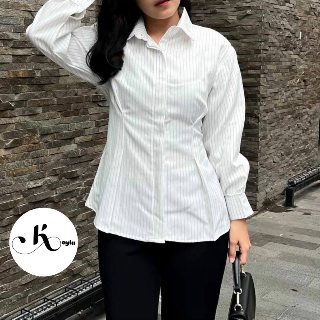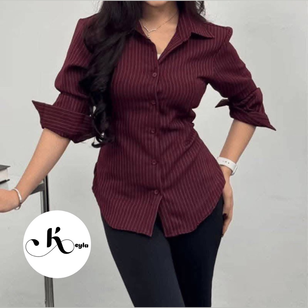 Keyla - Luna Stripe Fitted Shirt - Kemeja Atasan Wanita Salur Stripe - Kemeja Kantor Formal Casual Bahan Dasar Semi Wol
