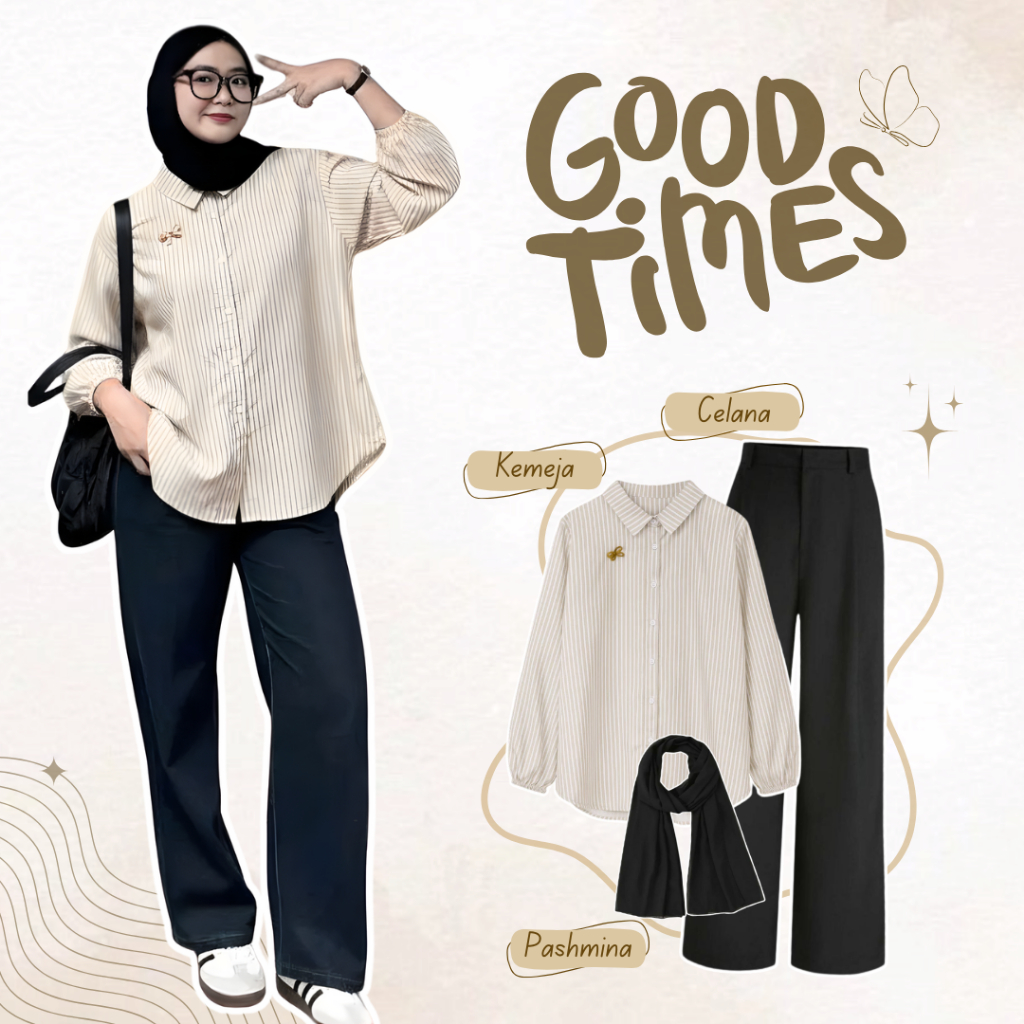 One Set Kemeja Wanita Korean Style (Kemeja Wanita Kekinian Korean Style + Celana Kulot Wanita + Pashmina Ceruty Hitam) |