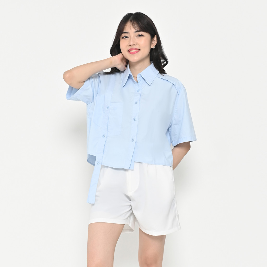 Queentin Kemeja Wanita Asimetris 1166 Cotton Wash Polos Lengan Pendek