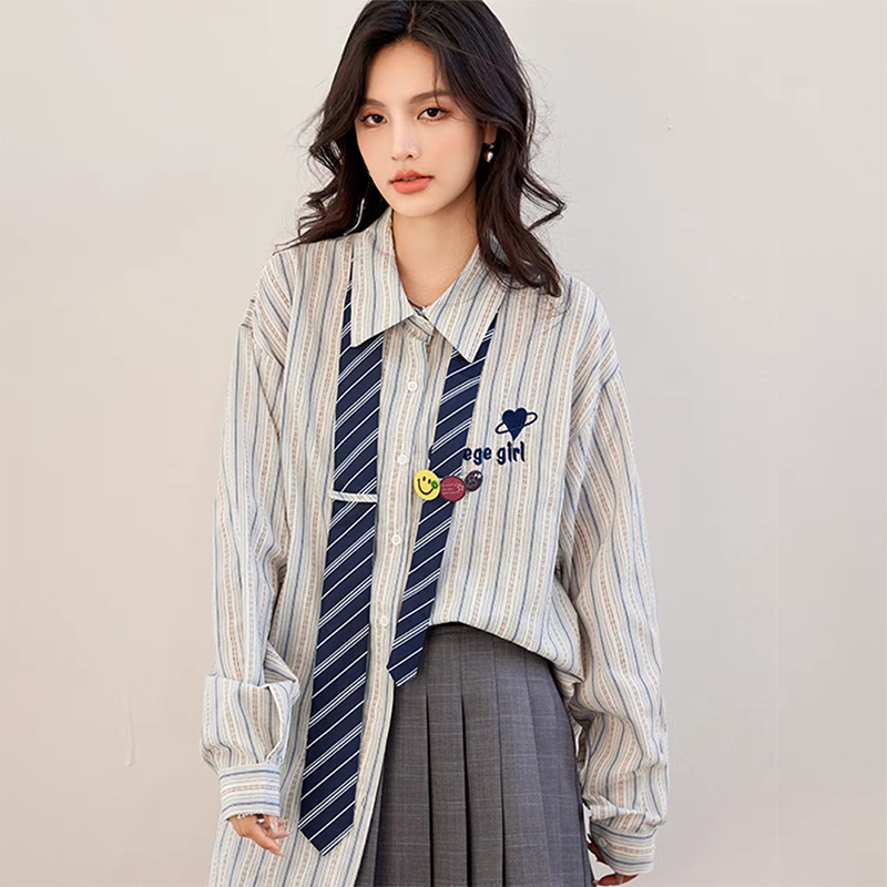 Meet.U【Dasi Kado】Kemeja Dasi Bergaris Korean Kemeja Wanita Lengan Panjang Atasan Wanita Oversize