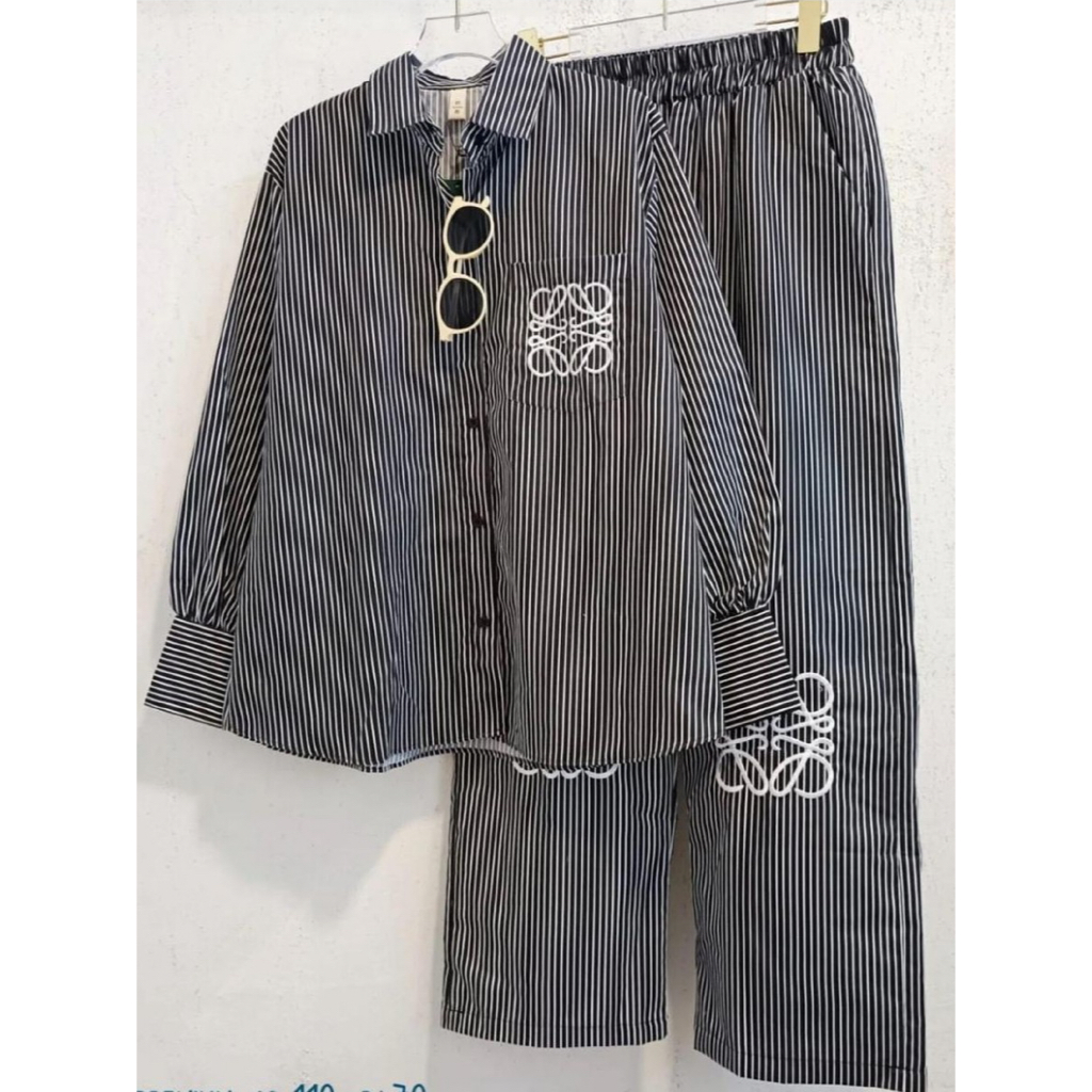 Ryujin Set | One Set Stripe Kemeja Wanita Lengan Panjang Motif Bunga + Celana Bahan Katun Premium