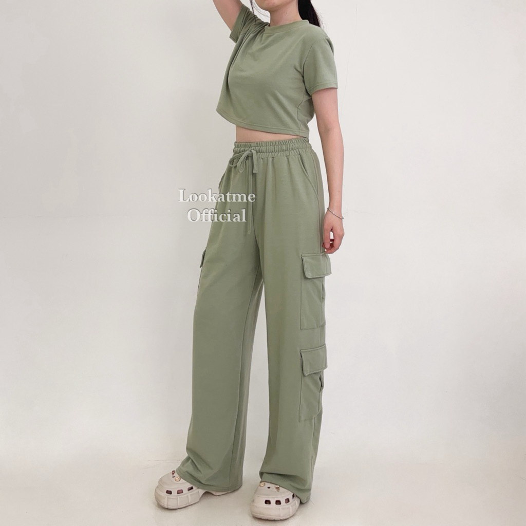 Taylor Set - One Set Top + Cargo Pants - Setelan Wanita Celana Kargo Loose Pants Full Karet Panjang