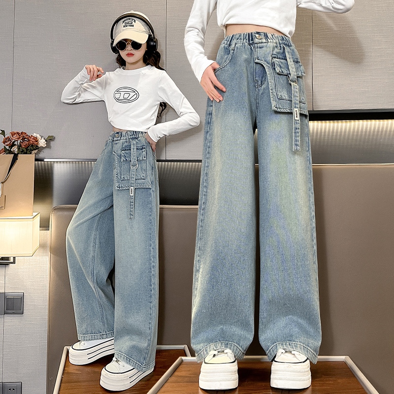 8-15 tahun Celana Jeans Anak Perempuan Style Baggy dengan Kualitas Tinggi Desain Korea serta Saku yang Fungsional Sangat Cocok untuk Pakaian Anak