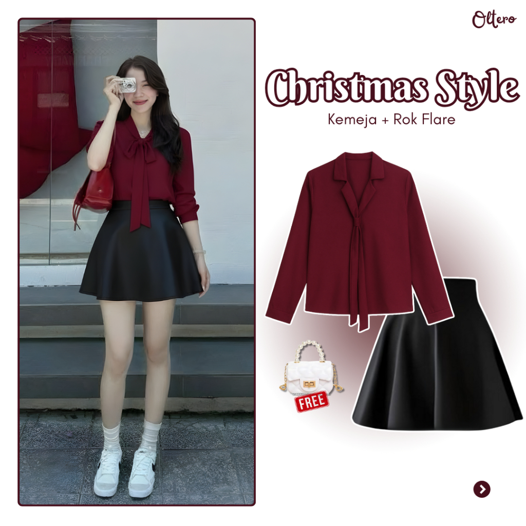 One Set Special Christmas Edition ( Kemeja + Rok Flare + Free Tas ) Ootd Outfit Natal Style - Ol105