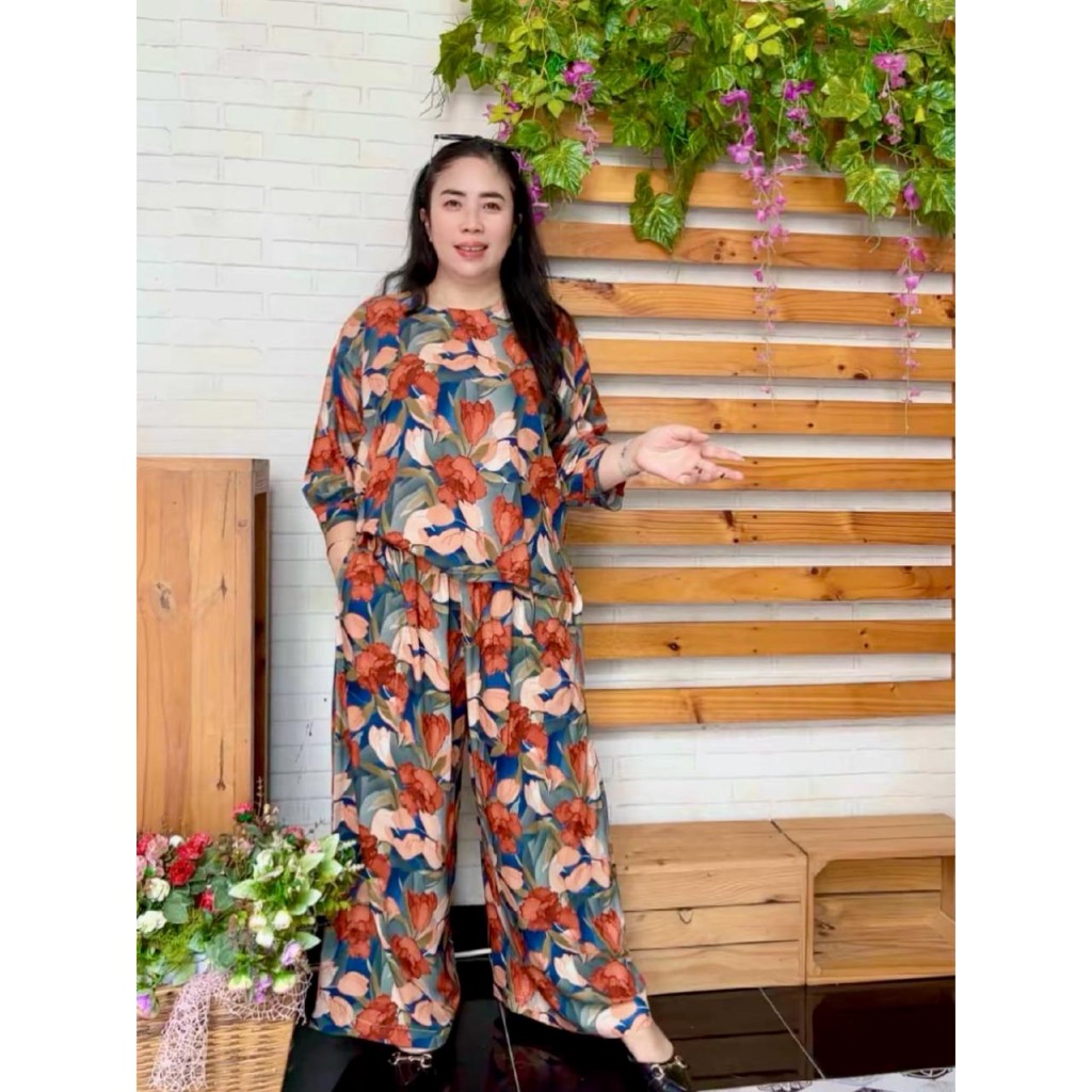 Richa One Set Setelan Baju Wanita Atasan Celana Kulot Panjang Jumbo Rayon Premium Motif