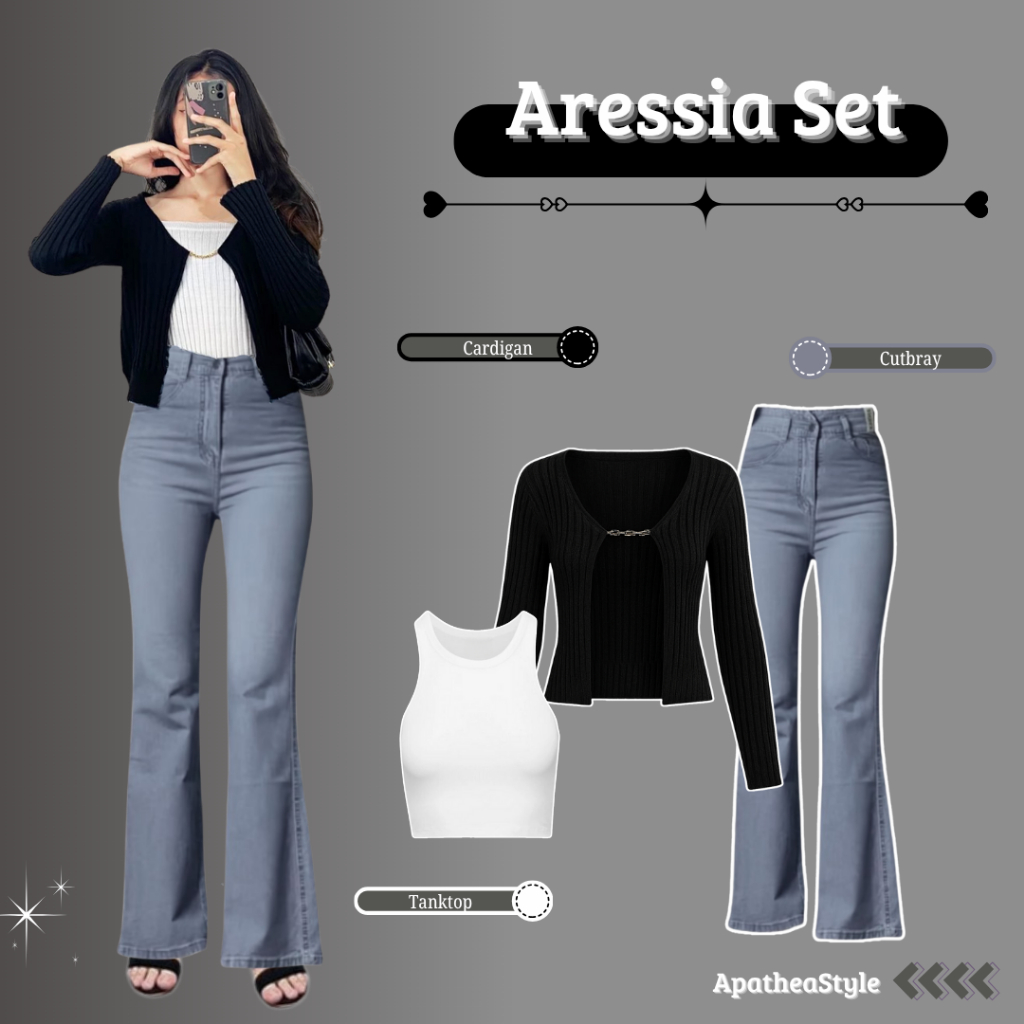 Apathea Style One Set Aressia Cardigan + Tanktop + Cutbray Jeans Set Wanita Kekinian Trending.