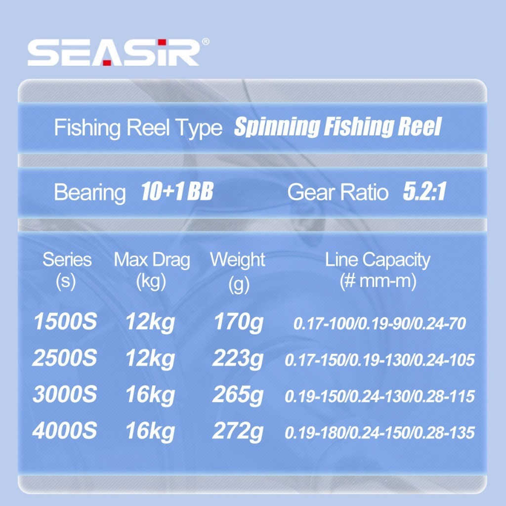 Seasir Expert Spining Fishing Reel Ultra-Long Casting Aluminium Shallow Spool 1500S-4000S, Power Handle 10+1BB, 5.2:1 Max Drag 16Kg, One-Piece Metal P
