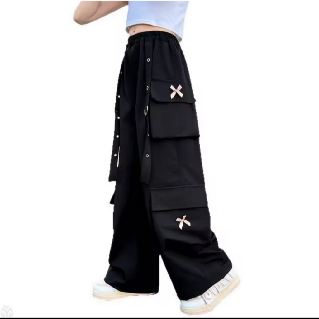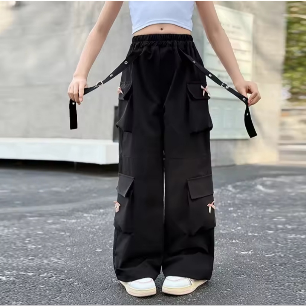 Celana Cargo Anak Panjang Trendy Unisex2–14Tahun Wide Leg Kekinian dengan Saku Besar&Aksen Pita Imut