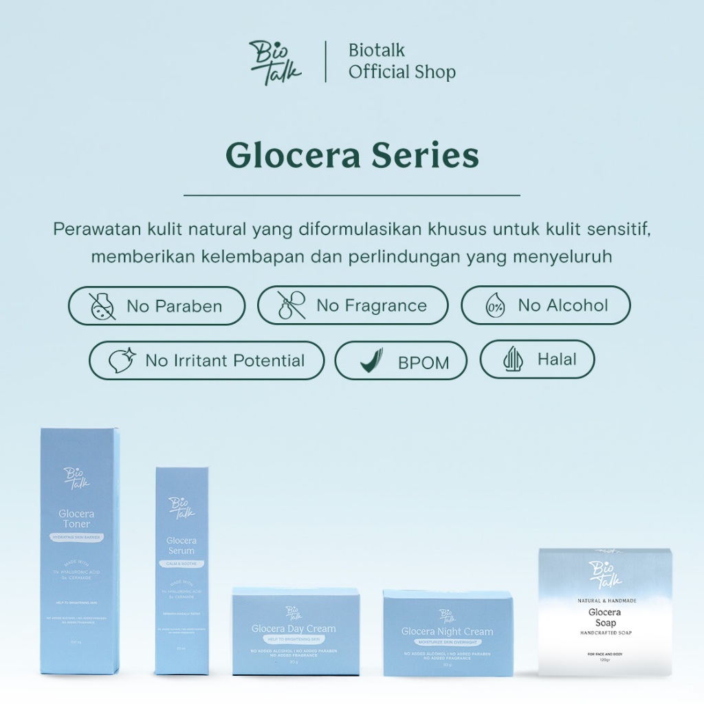 Biotalk Glocera Series (Extra Hydrating Bundle) | No SLS/SLES | Sabun Mandi Batang Natural | Toner | Serum | Day Cream |