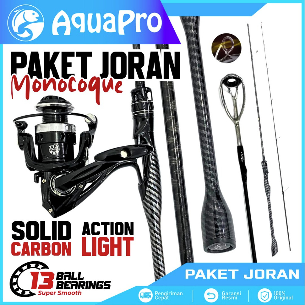 AquaPro Paket Set Joran Pancing Spinning Rod Monocoque Solid Carbon dengan Reel Pancing Spool Metal
