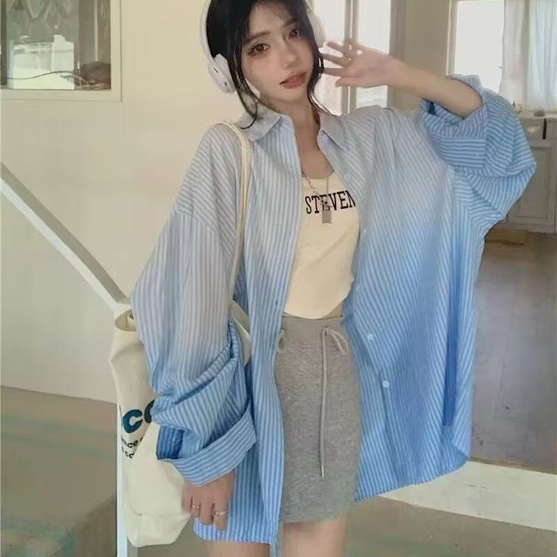 Kemeja Wanita Garis-Garis Gaya Korea Longgar Warna Gradien Atasan Kemeja Lengan Panjang