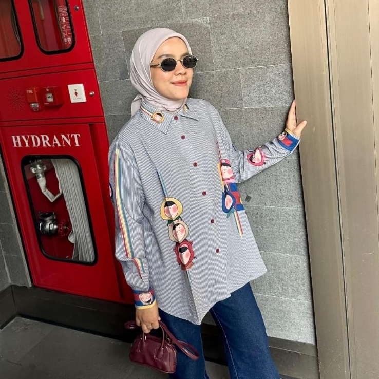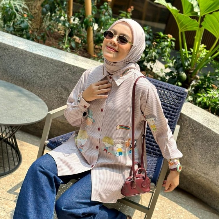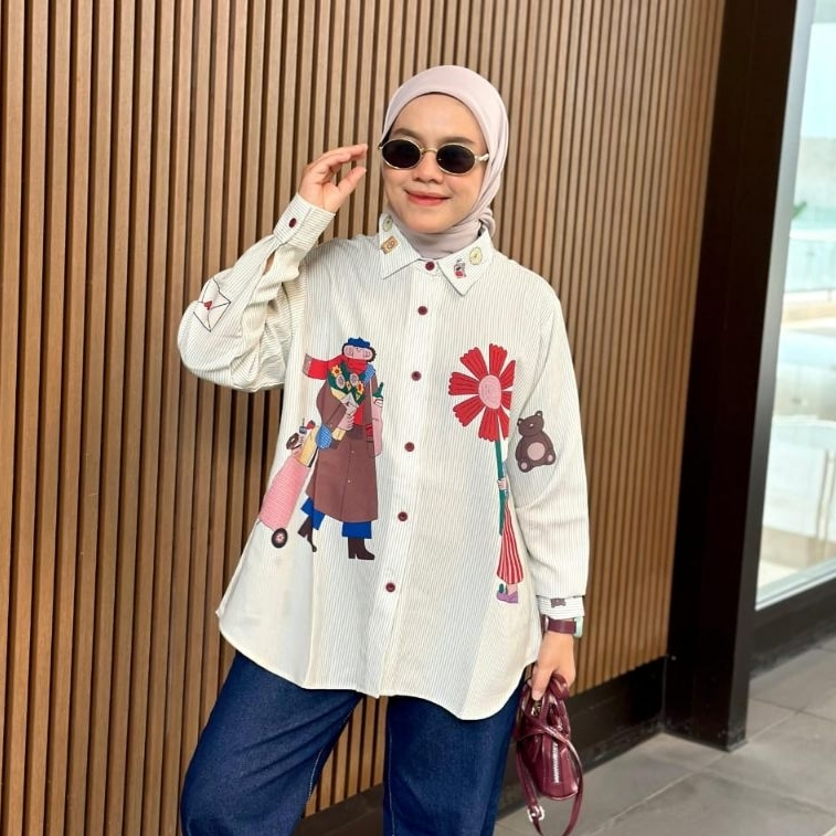Yuki Cartoon Printed Shirt | Atasan Oversize Kemeja Silk Premium Full Printing Salur Motif Lucu Unik Wanita