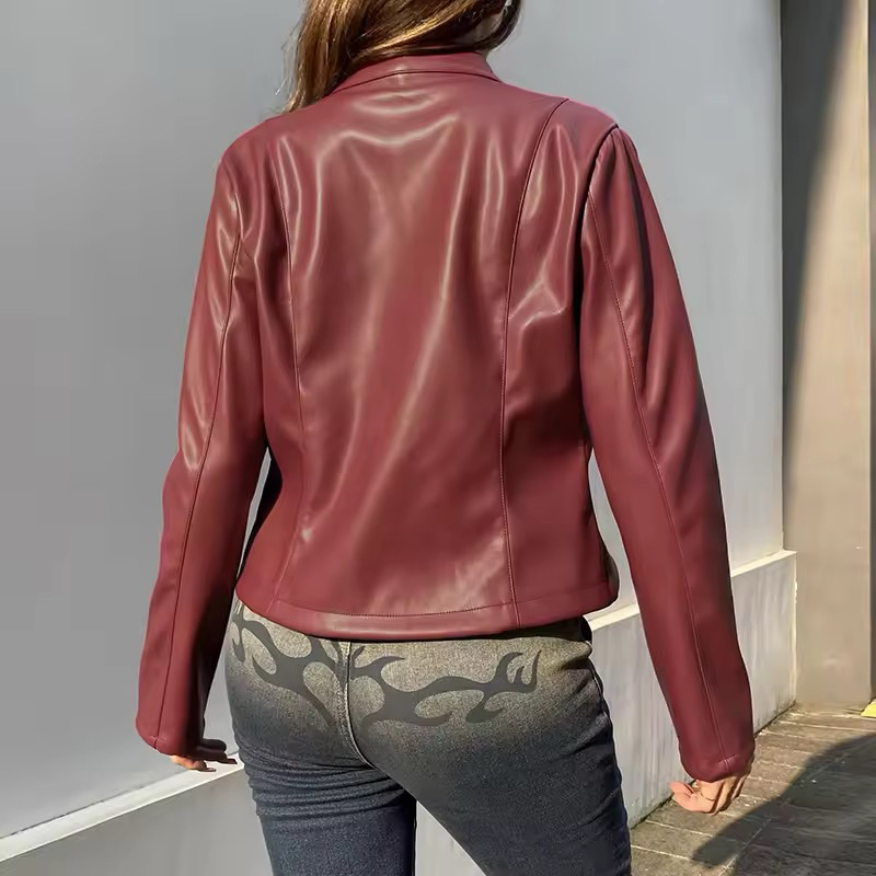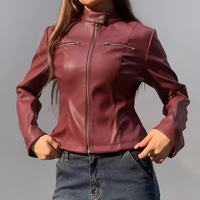 Hanifoleather.Id-Jaket Kulit Wanita Kasual Kerah Berdiri Risleting Musim Semi