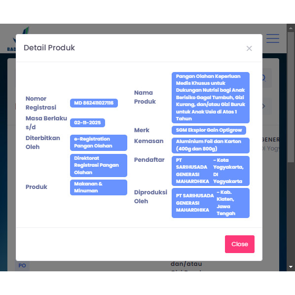 SGM Eksplor Gain Optigrow 1 Plus Vanilla 400 Gram