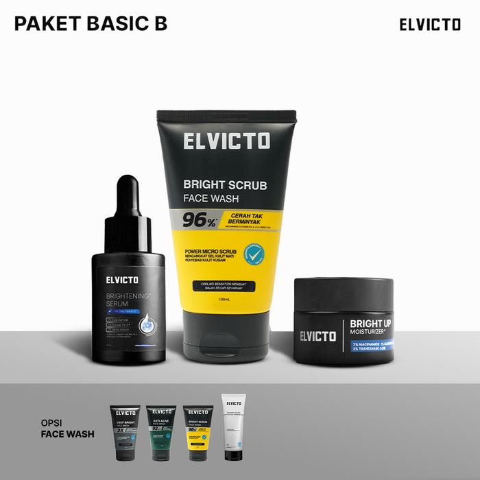 ELVICTO PAKET BASIC B SERUM FACE WASH BRIGHT UP MOISTURIZER Paket Perawatan Pria untuk Kulit Kusam,