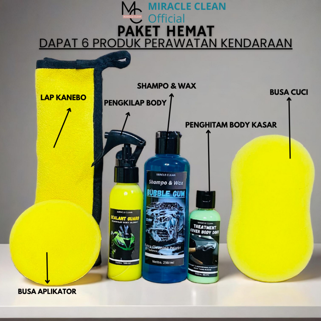Miracle Clean Paket Lengkap Cuci Perawatan Kendaraan Shampo Pengkilap Body Penghitam Body Doff Pembersih Kerak Kendaraan Semir ban Busa Aplikator Lap Micro Kuas Lebih Hemat