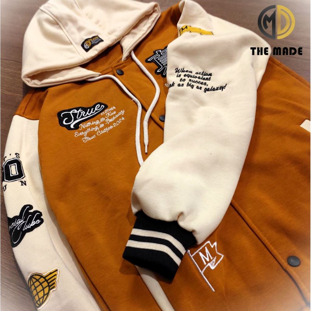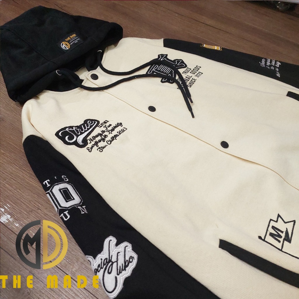 Jaket Varsity Baseball Full Bordir Kupluk - Jaket Varsity Hoodie Vintage Pria Wanita Terbaru Full Label Full Tag bahan Tebal Warna Hitam Cream Navy Hijau Marun Putih Size M L XL XXL