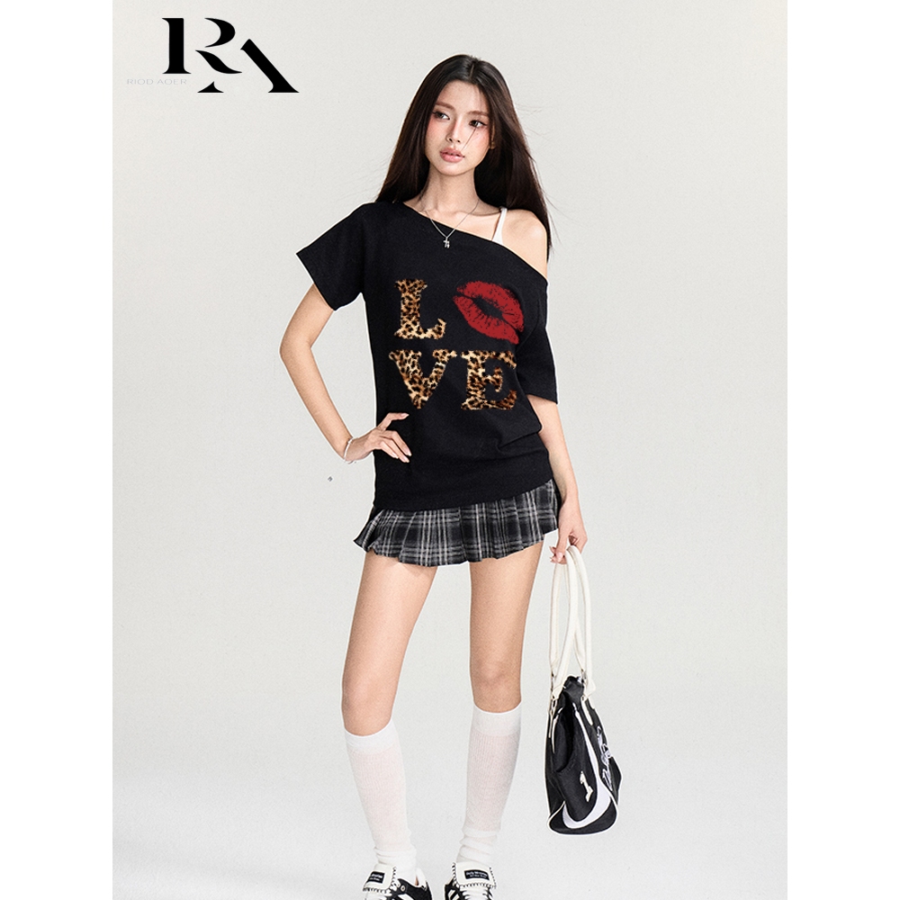 RIOD AOER baju atasan wanita terbaru Amerika Y2K macan tutul huruf cetak kaos lengan pendek wanita longgar off-the-shoulder top wanita kaos wanita