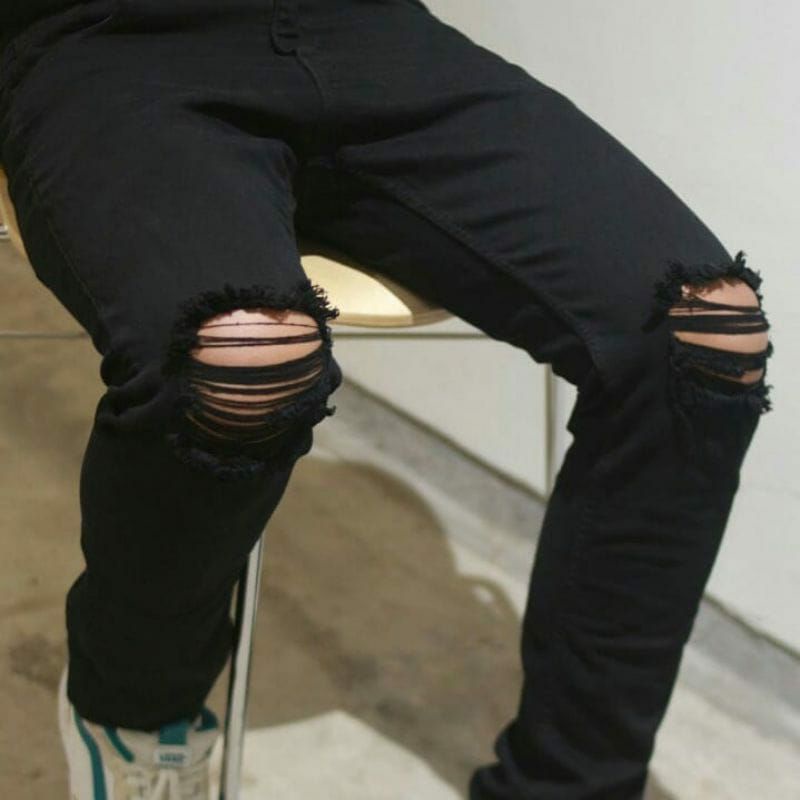 CELANA JEANS PRIA SOBEK RIPPED ROBEK SLIMFIT PENSIL STRETCH HITAM PREMIUM 27-38