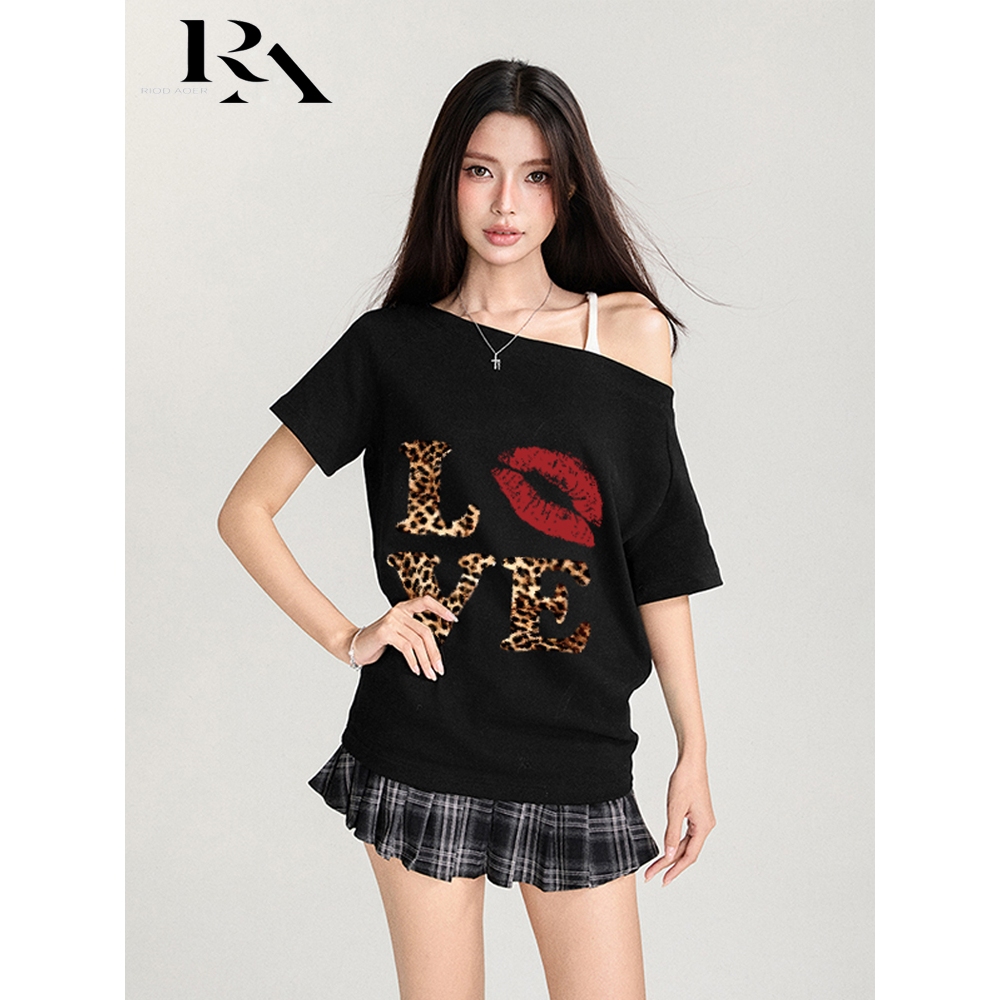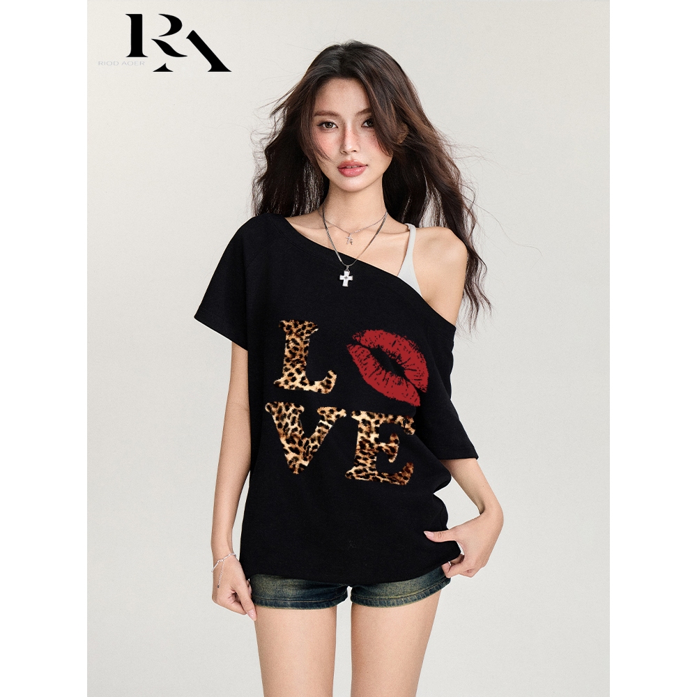 RIOD AOER baju atasan wanita terbaru Amerika Y2K macan tutul huruf cetak kaos lengan pendek wanita longgar off-the-shoulder top wanita kaos wanita