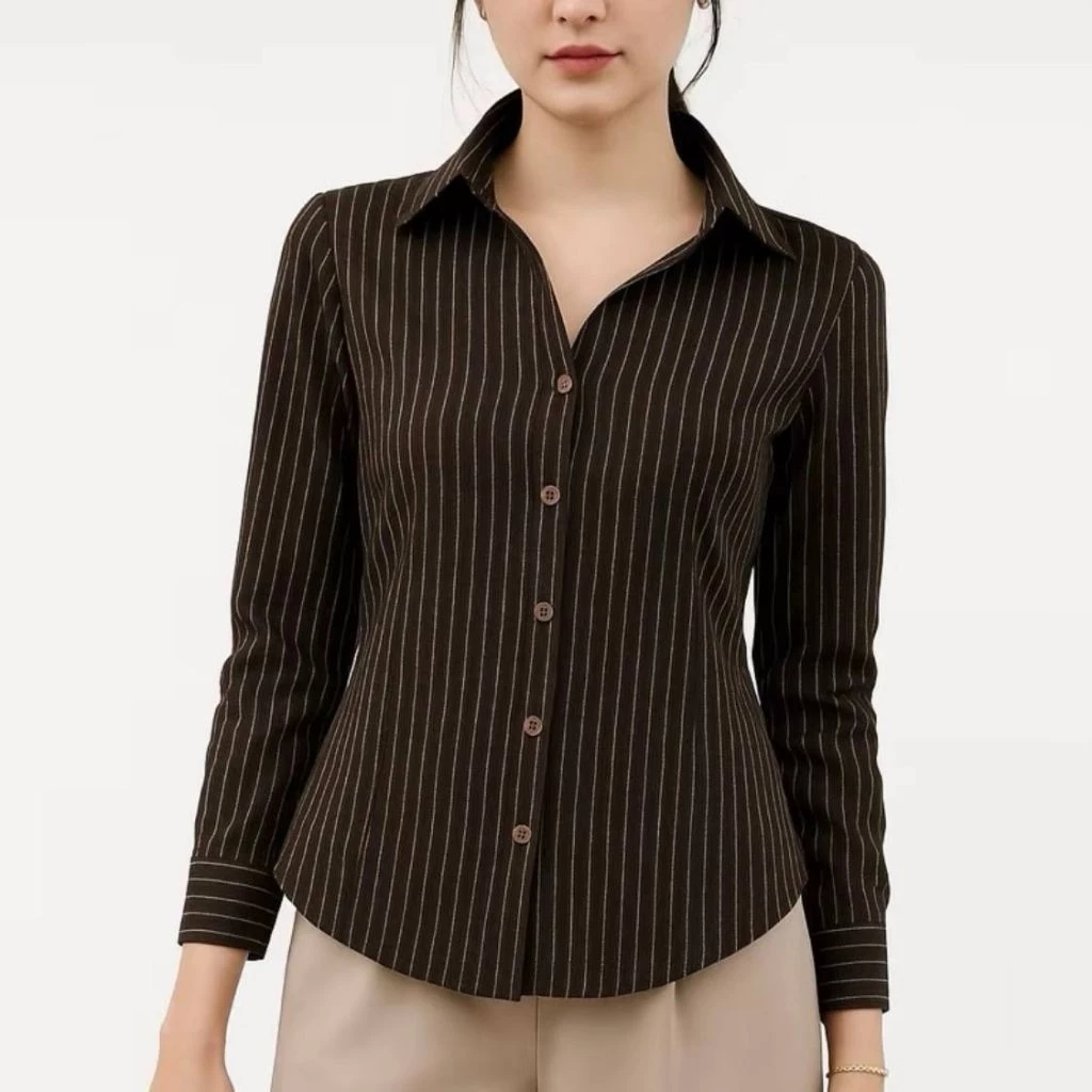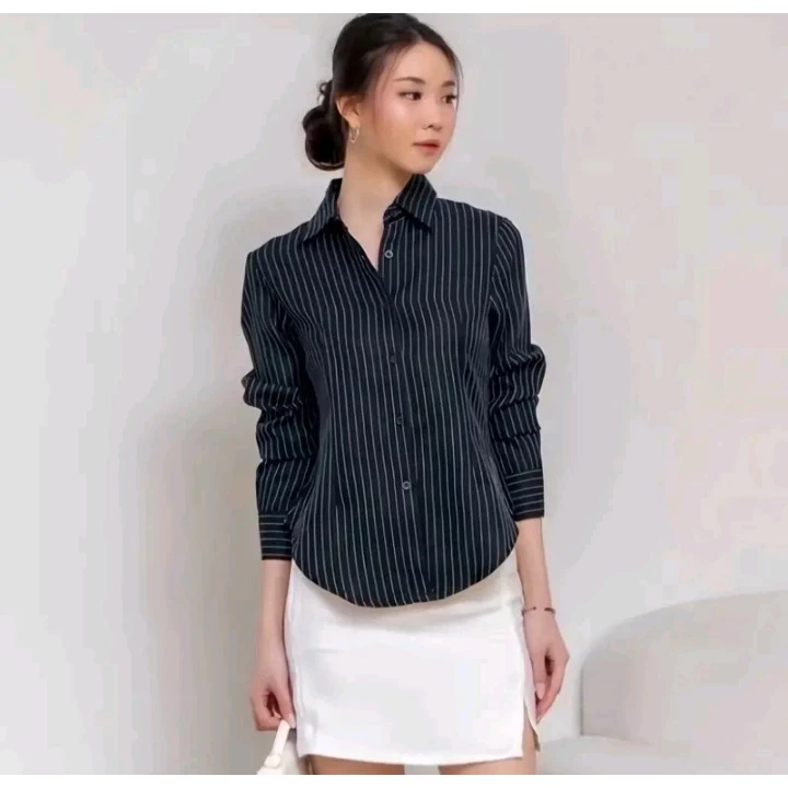 Kemeja Luna Stripe Salur Fit Body Wanita Bahan Semiwool
