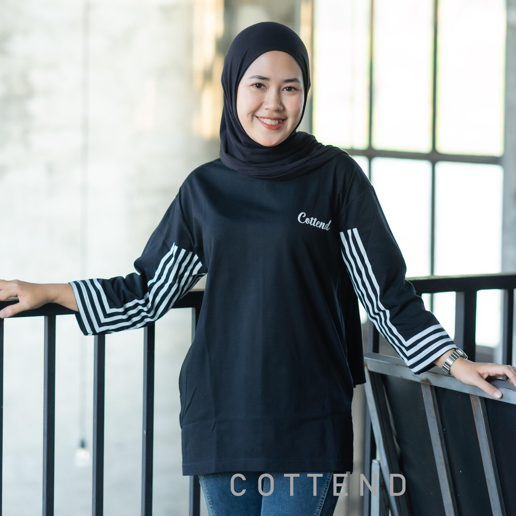 COTTEND Oversized Striped Stylish Baju Kaos Atasan Wanita Lengan 7/8 Sablon Garis Bahan Katun Combed Tebal Nyaman Dipakai