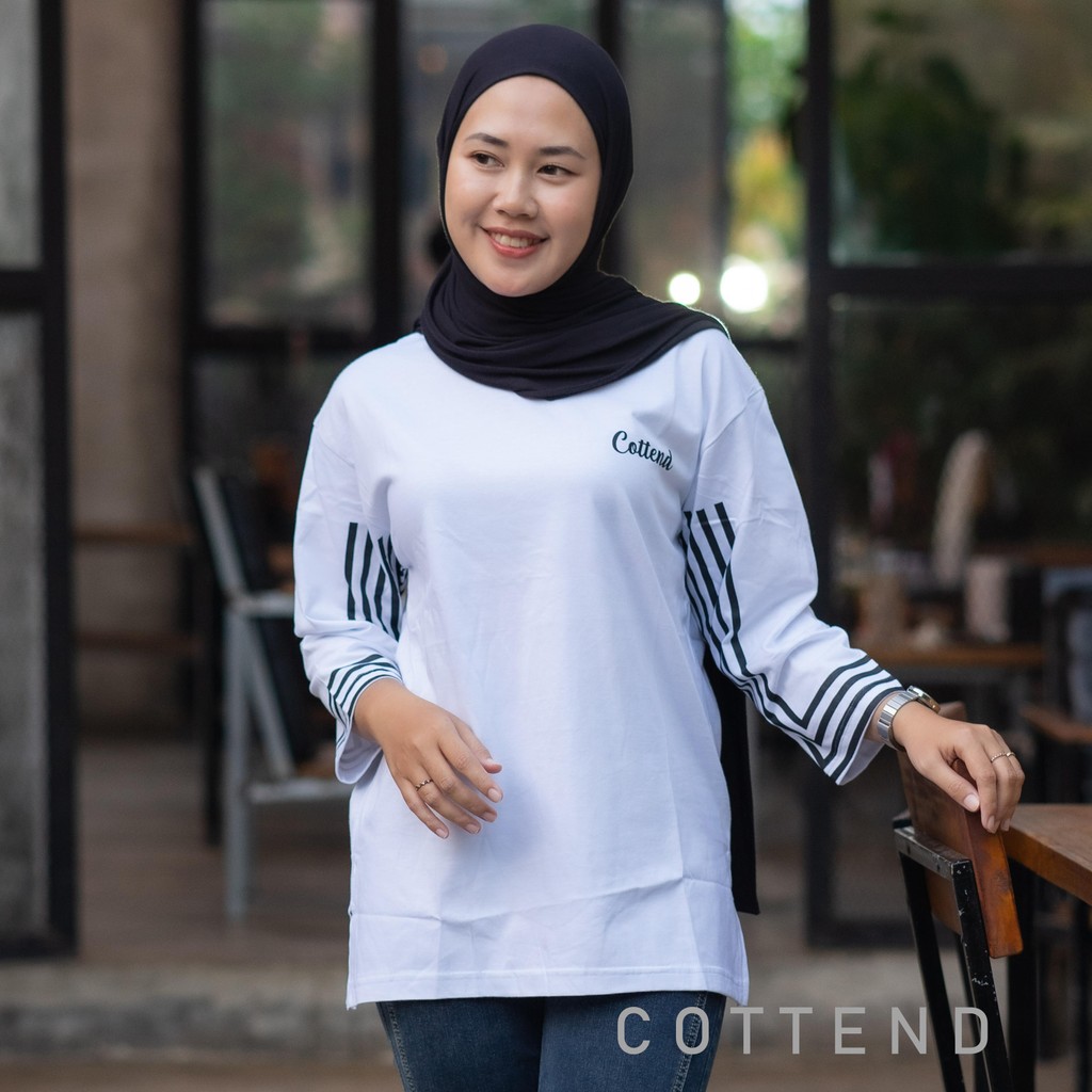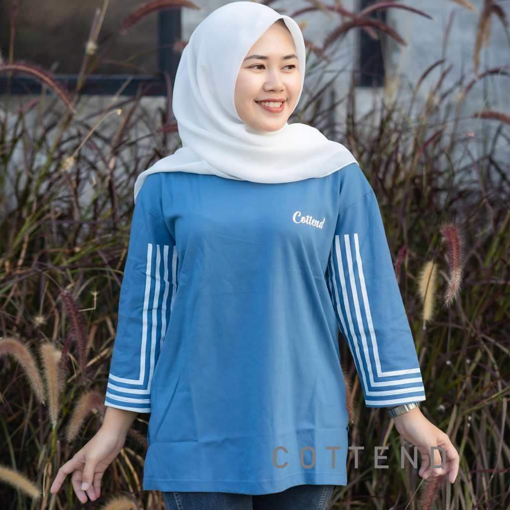 COTTEND Oversized Striped Stylish Baju Kaos Atasan Wanita Lengan 7/8 Sablon Garis Bahan Katun Combed Tebal Nyaman Dipakai