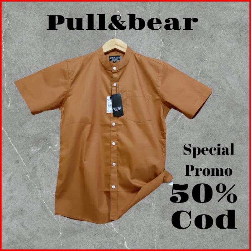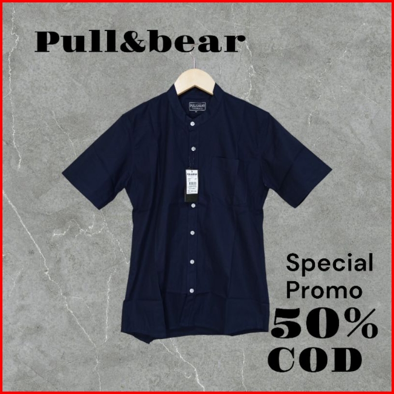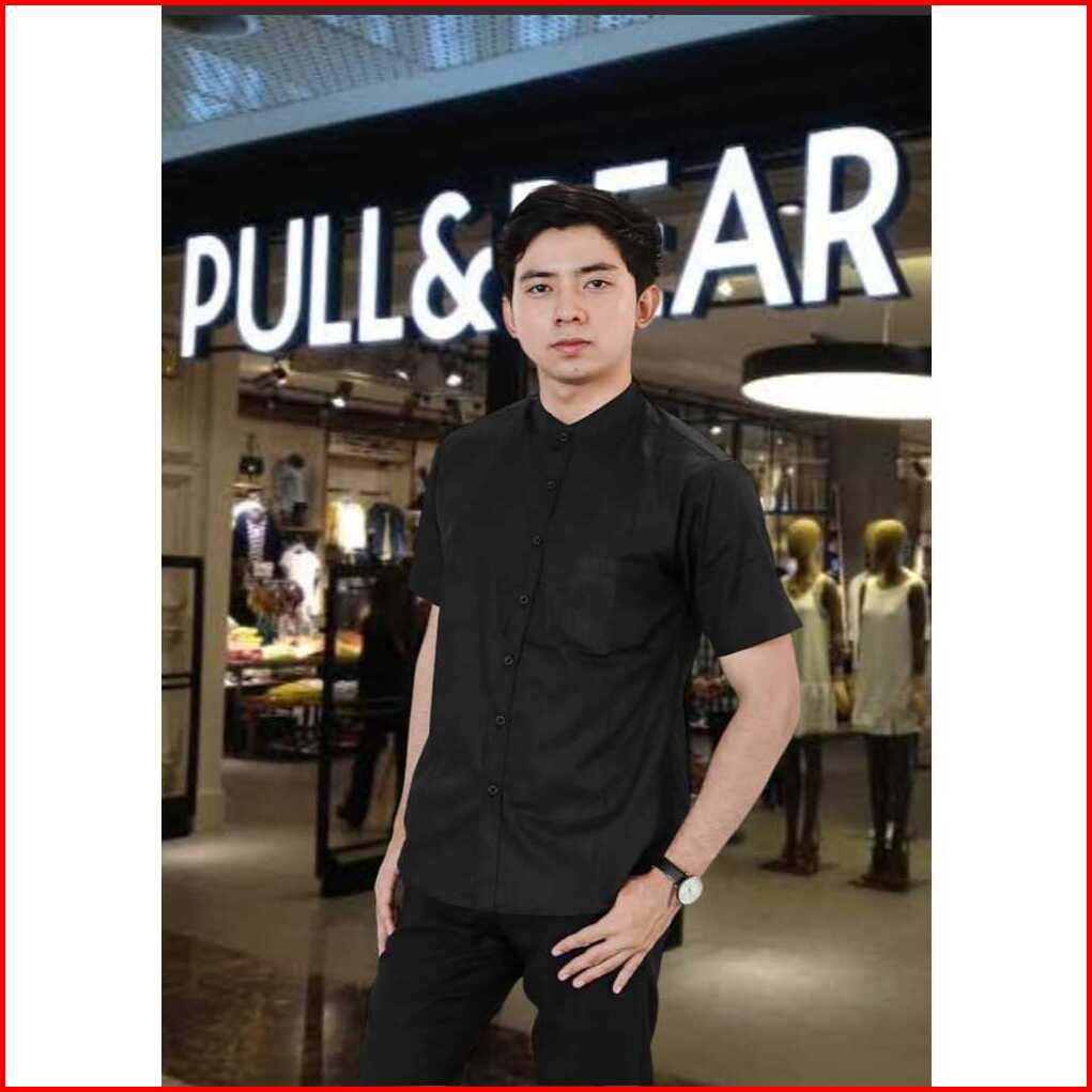 Kemeja Pria Polos Pull Bear Atasan Cowok Lengan Pendek Kerah Sanghai Hitam