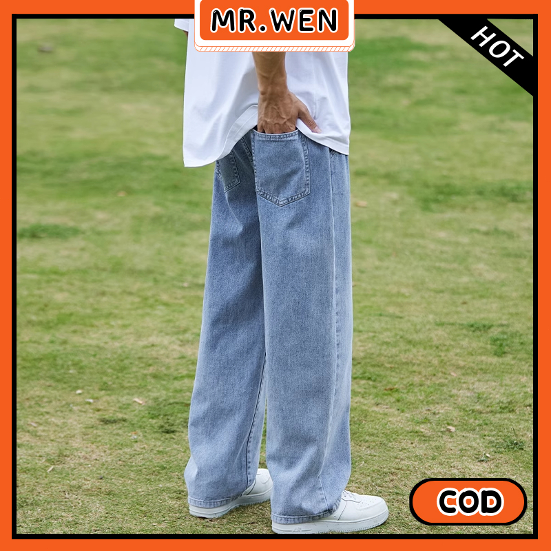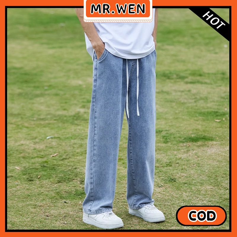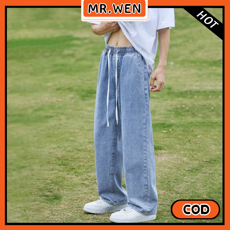 Celana Jeans Pria Pinggang Karet Biru Muda Lurus Longgar Celana Kasual Baru 2025 Celana Jeans Pria