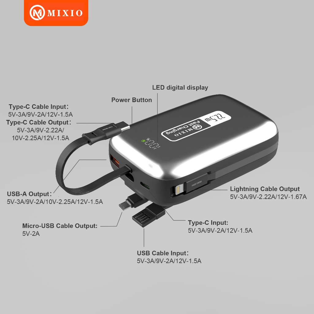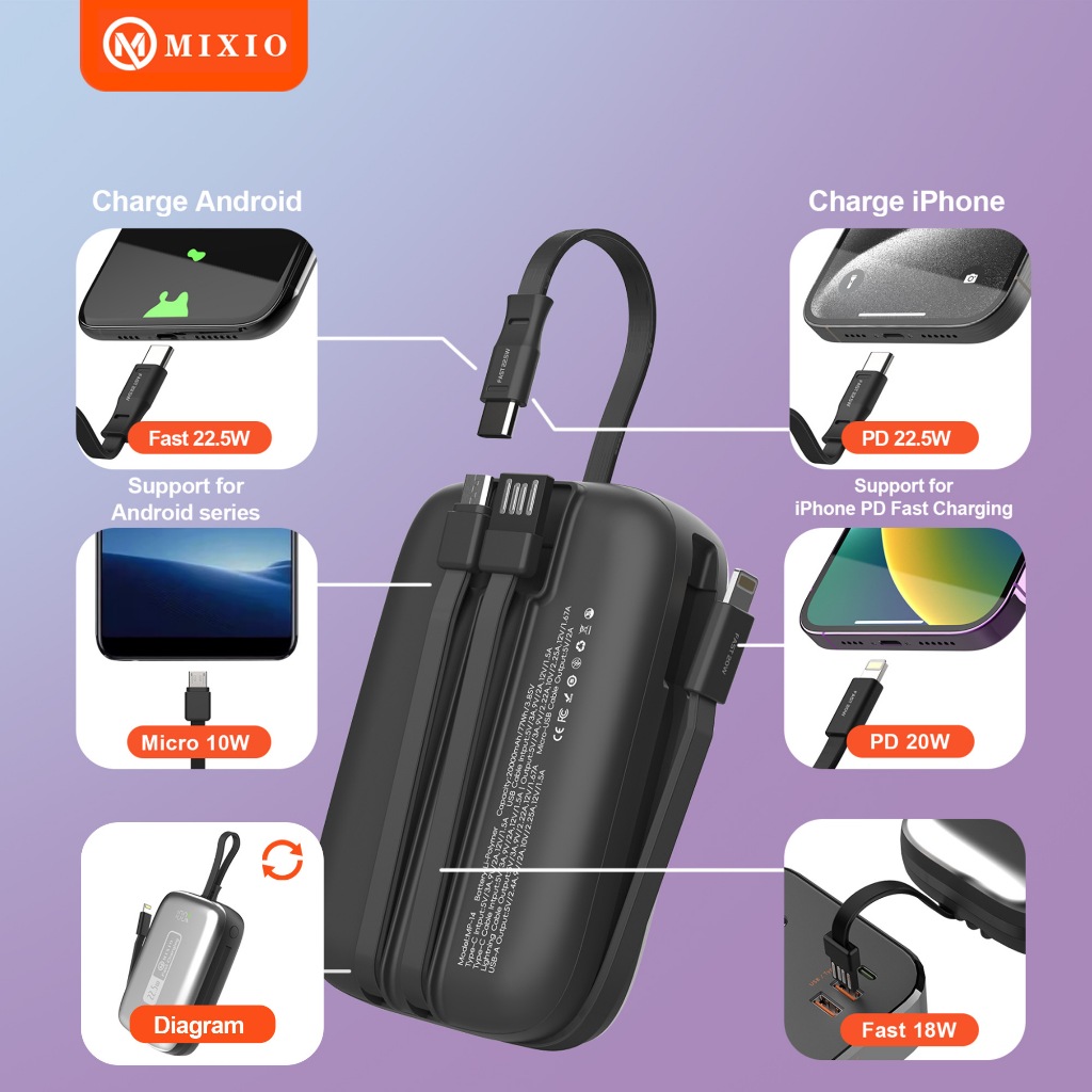 Mixio Mp-14 20000Mah Small Size Powerbank 22.5W With Kabel Fast Charging Lightning & Type C & Micro Usb For Iphone/Andro