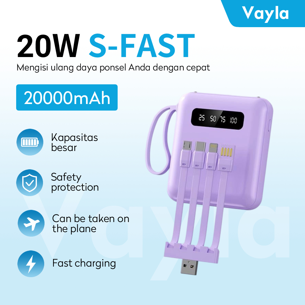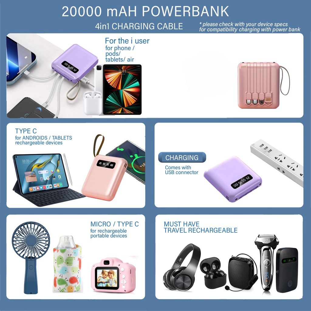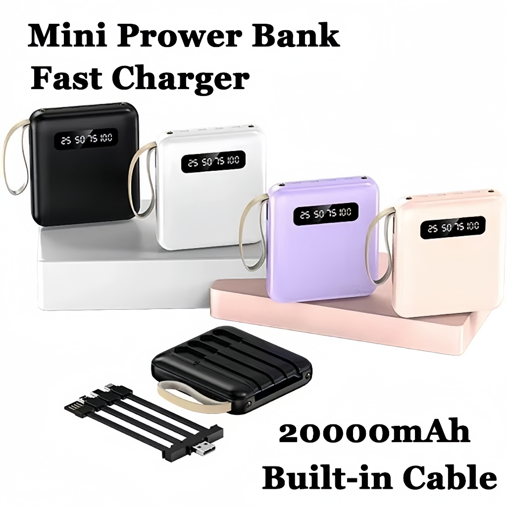 Mini Size Powerbank 20000Mah With 4 Cable Fast Charging Lightweight Led Senter Display Power Bank External Powerbank Por