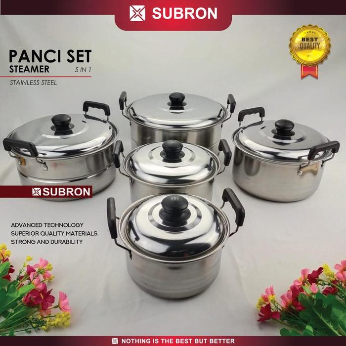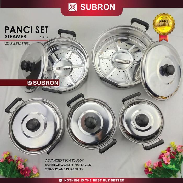 SUBRON Panci Set 5 IN 1 Panci Sup Rebus Kukus Stainless Steel Steamer Soup pot Gambar