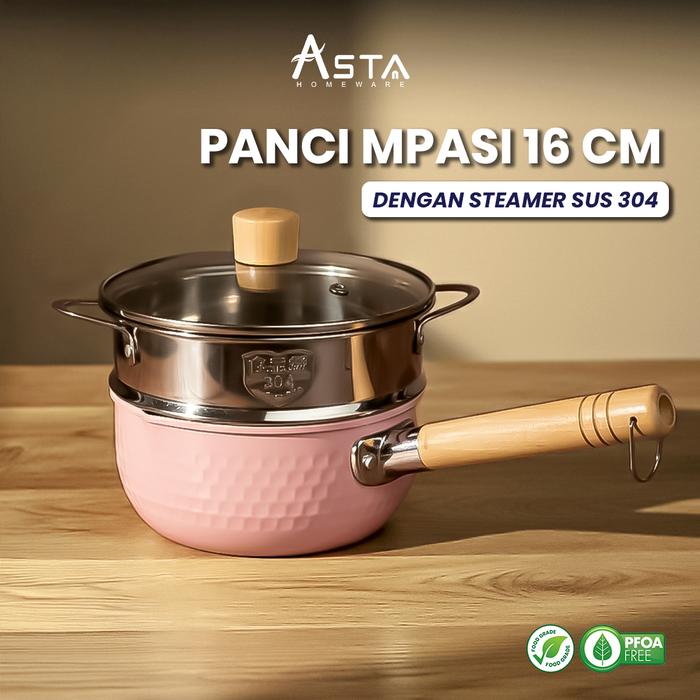 Asta Sauce Pan Panci Stainless Kukusan Mpasi Anti Lengket Tutup Kaca 16 cm Multifungsi Kitchenware