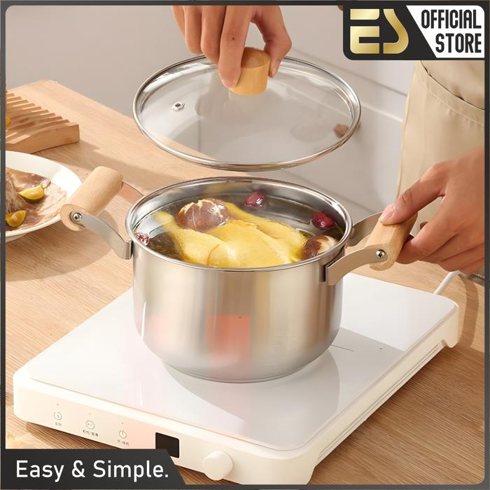 [ES x Mak San] Panci Sup Stainless Dengan Kukusan Gagang Kayu Tutup Kaca Anti Lengket Ukuran 20cm