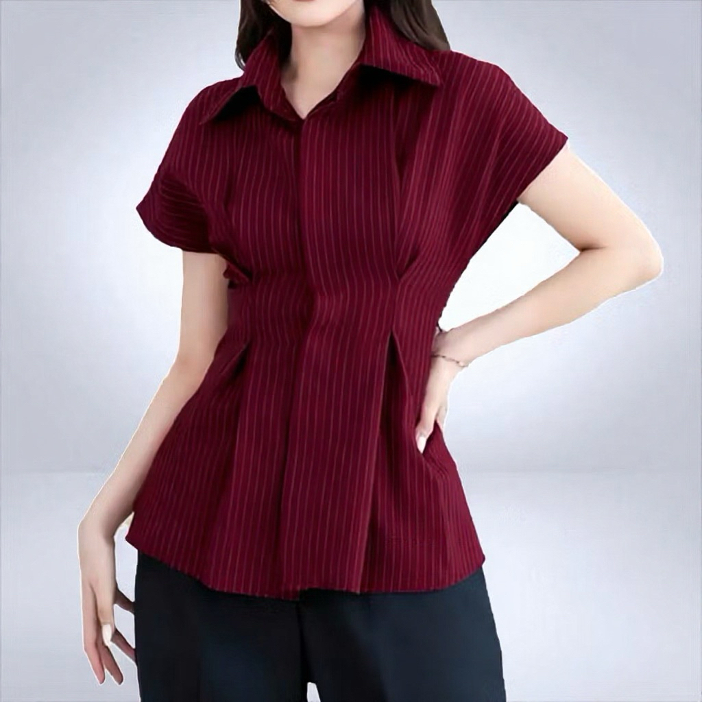 Atasan Wanita Lengan Pendek Slim Fit - Kemeja Wanita Fitted Stripe Salur Basic Casual Bahan Semi Woll - Kemeja Wanita Terbaru