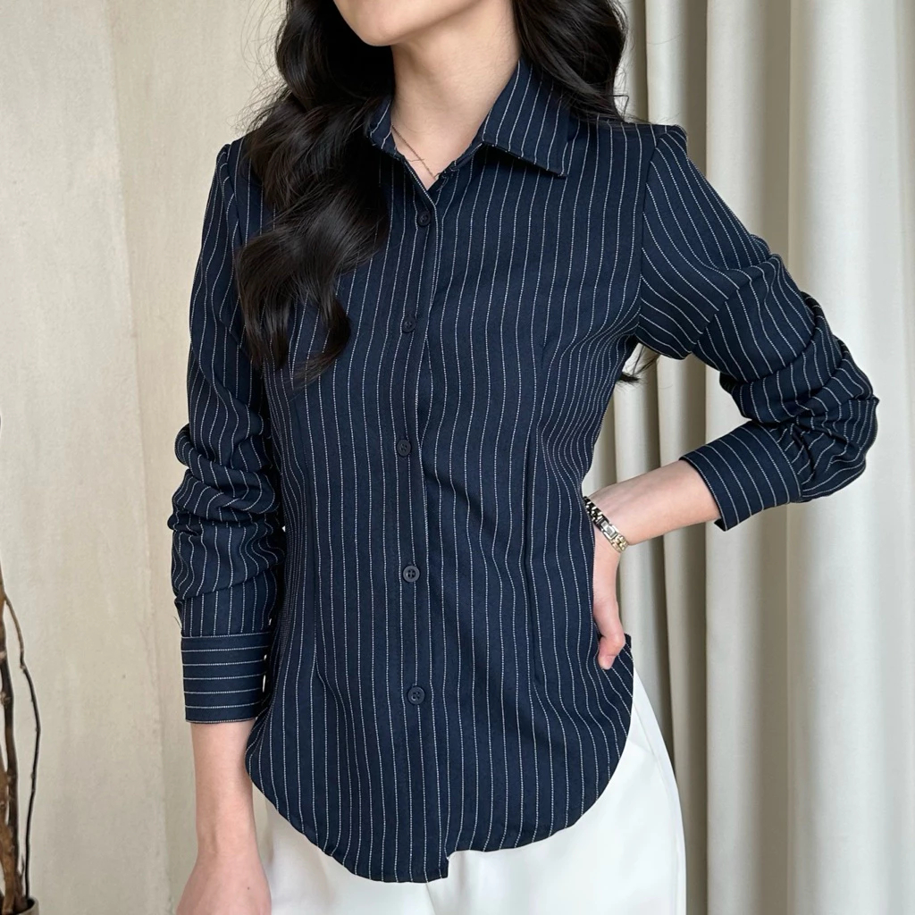 Kemeja Salur Slim Fit Wanita Ashley Korean Stripes Katun