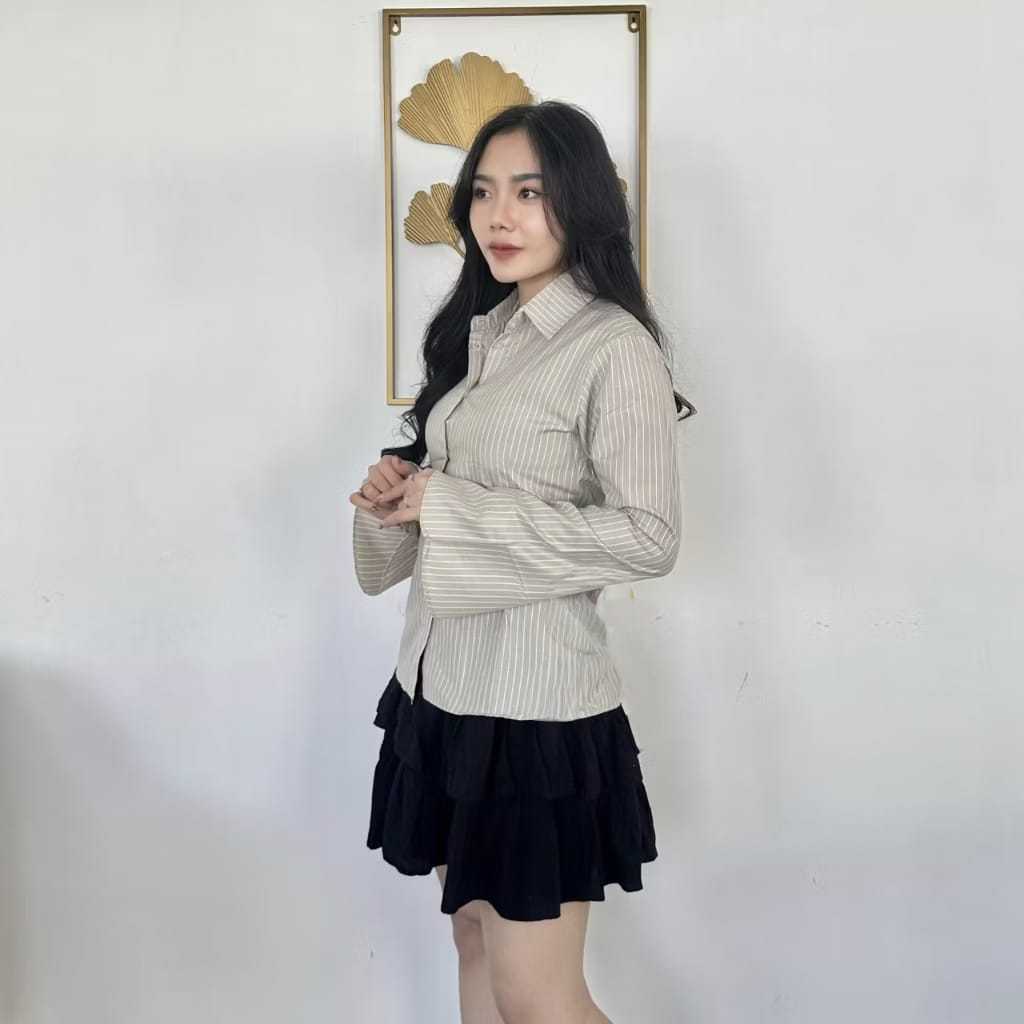 Kemeja Wanita Kekinian Motif Salur Garis Stripe Slim Fit Body Wispie Katun