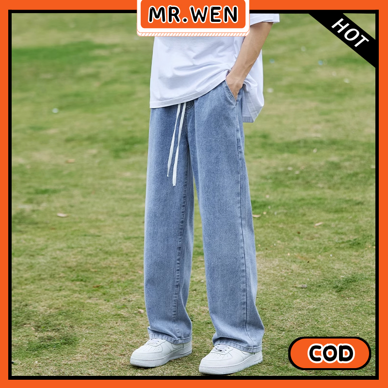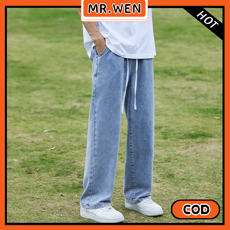 Celana Jeans Pria Pinggang Karet Biru Muda Lurus Longgar Celana Kasual Baru 2025 Celana Jeans Pria