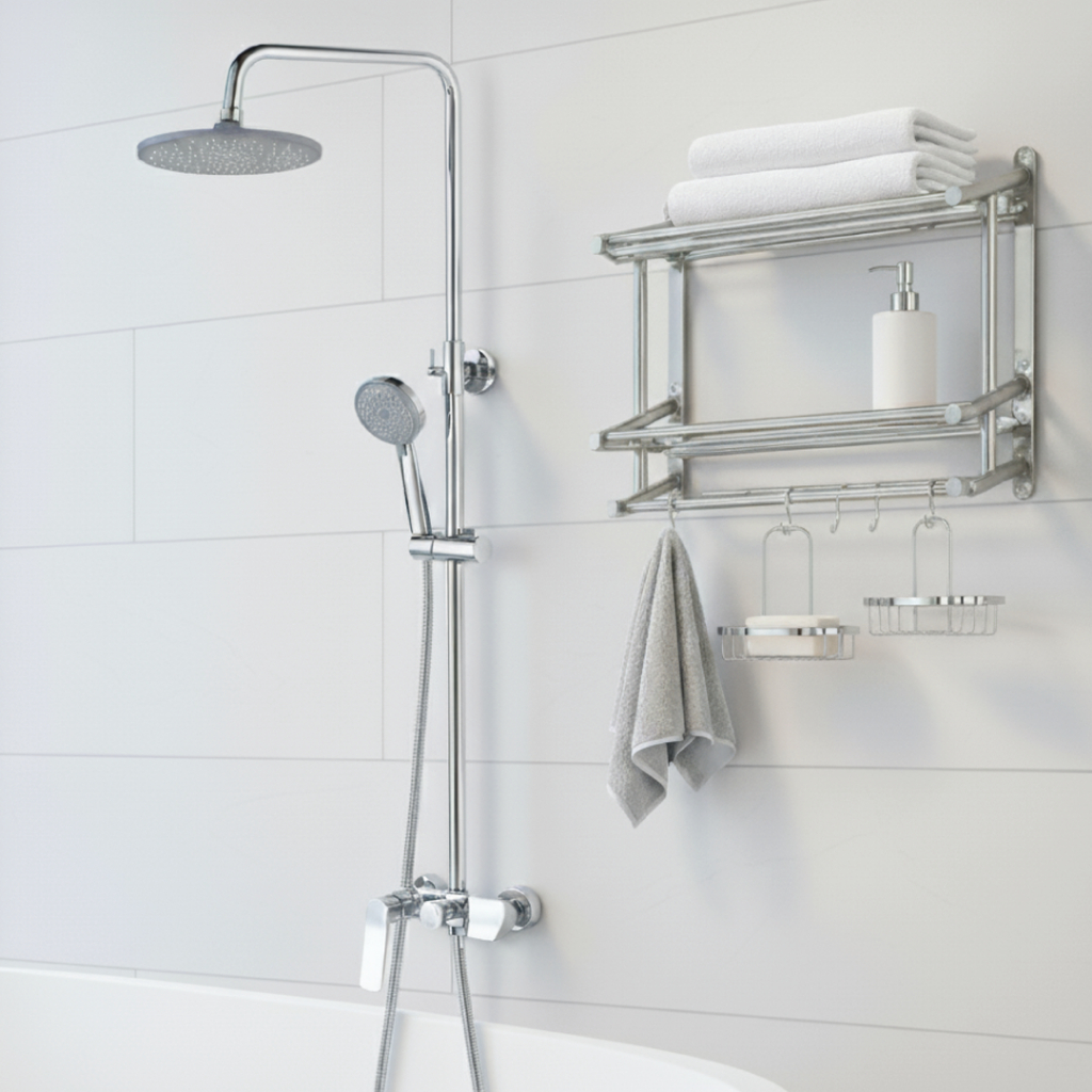 ONDA PAKET HEMAT Rain Shower Tiang RS RENEW + FREE Rak Kamar Mandi Double Anti Karat DOMENICO